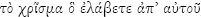 28 BDAG (2000) onderskei twee sienings: "anointing (so lit. Ex 29:7) 1J 2:20, 27a, b, usu. taken to mean anointing w. the Holy Spirit (differently Rtzst., Mysterienrel.'27, 396f, who thinks of the "formal equation of the baptismal proclamation w. the χρίσµα)'. Soos uitgewys kan dié twee sienings ook gekombineer word. Liddell en Scott (1968:ad loc.) wys daarop dat in klassieke Grieks die woord gebruik word vir enigiets wat "aangesmeer word"; dit kan ook gebruik word om te verwys na 'n "opdrag wat gegee is" (sien Louw & Nida 1996:ad loc.). Brown (1986:342-347) en Strecker (1989:126-128) gee 'n goeie oorsig hieroor. Sien ook Klauck (1991:156-158); Schnelle (2010:ad loc.).