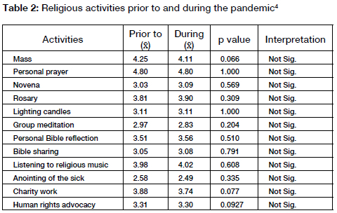 The t-test indicates that there is no significant difference in women's performance of twelve religious activities (Mass, personal prayer, group meditation, bible reading, bible sharing, praying the rosary, lighting a candle, listening to music, novena, anointing of the sick, funeral/memorial rites, charity, human rights advocacy, rituals) prior to and during the pandemic. In all of these activities, the p values are more than .05.