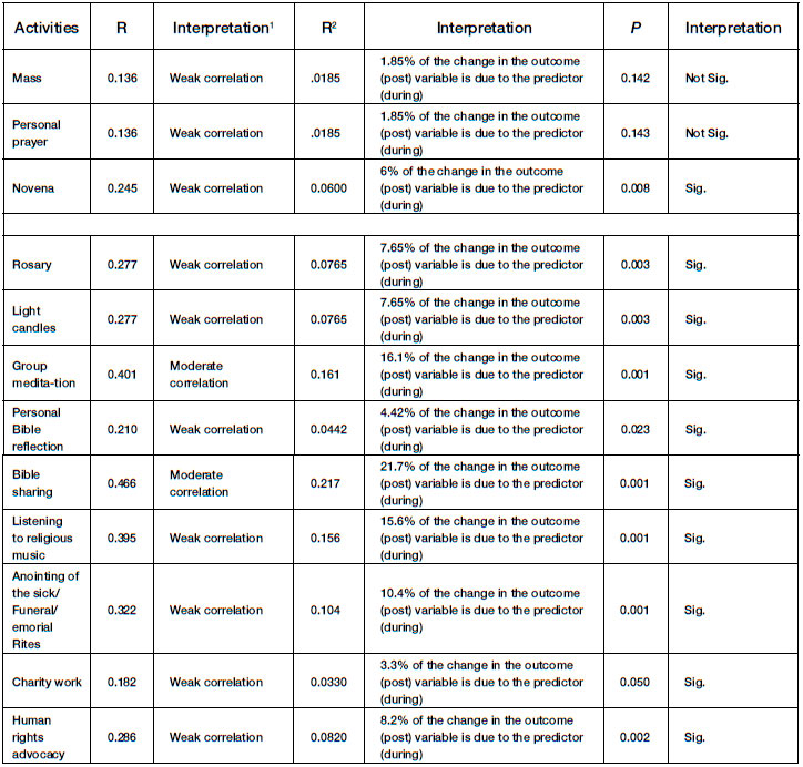 The scores for the online religious activities during the pandemic and the expected online religious activities after the pandemic were compared as shown in the table below. These were subjected to regression and standard normal distribution analysis. The results indicate a significant cause-and-effect relationship between the religious activities during the pandemic and the projected online religious activities after the pandemic for the following activities: rosary (p=.003); novena (p=.008); lighting candle to God or a saint (p=.003); group meditation (p<.001); personal Bible reading (p=.023); Bible sharing (p<.001); listening to religious music (p<.001); anointing of the sick and other rituals (p=<.001); charity work (p=.05), and human rights advocacy (p=.002). In other words, an increase in their participation in some religious activities during the pandemic predicts a significant increase in this activity online after the pandemic.