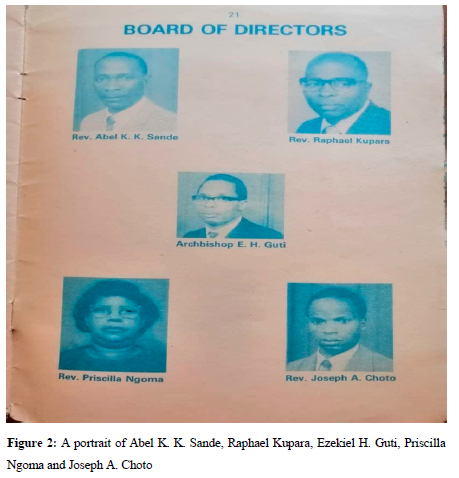 While differing perspectives exist between the two traditions, it is acknowledged that Mai Ngoma was the inaugural Chairperson of the prayer band group, which later became known as the EGEA. Katsvere (2014) agrees with the tradition that this group significantly contributed to the expansion and proliferation of the AOGA rather than its founding, attributed solely to Guti. In appreciation for the support of the prayer band group, Guti appointed the four principal members - Priscilla Ngoma, Abel K. K. Sande, Raphael Kupara, and Joseph Choto - as the co-directors, with himself serving as the chairperson, as illustrated in the 1977 portrait retrieved from a newspaper in the National Archives of Zimbabwe (see Figure 2).