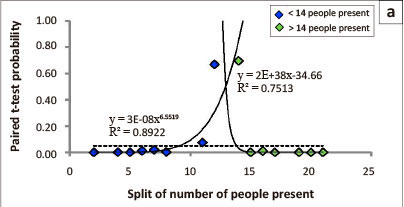 There was concern that the results obtained might be a common consequence of such an analytical approach primarily because it was noticed that there was a differential response in the initial data analyses. Best fit for a probabilities from paired t-tests against the people split was achieved when n*,j < 15 and β2> 0, whilst n*,j> 15 and β < 0. We thus randomly re-arranged the response time data amongst the number of people present and recalculated response curves and paired t-tests for the equivalent series of n*,j values in the same way as before. The residual sum of squares was then used to which 1 was added if n*,j < 15 and β2 < 0 and 1 again if n*,j> 15 and β2 > 0. We termed this the residual sum of square fitting index (RSSfi), which reflects whether similar types of models fitted to observed data did better when fitted to rearranged data. To check this we repeated this simulation 500 times and constructed a frequency distribution of RSSfi. It was concluded that the observed pattern is most likely unique at the 90% confidence level if it falls within the lower 10% of the distribution of RSSfi.