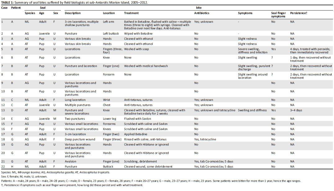 We contacted Marion Island seal biologists and asked them to provide details of any seal bites they had sustained, including treatment of the bite (as well as antibiotics administered, if any) and symptoms associated with the bite in the bitten limb. The South African Department of Environmental Affairs (DEA) released their available medical records for the island (n = 3 bite wounds) and medical staff (n = 3) that were stationed on the island and provided their personal records or recollections of bites.