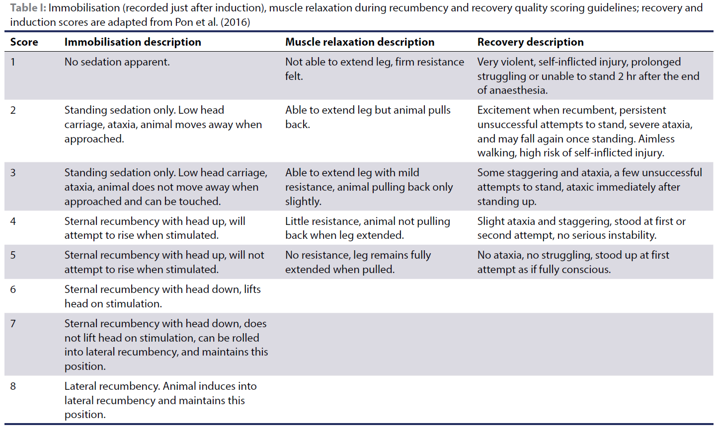 Quality of immobilisation was scored just after induction using the scoring established in white-tailed deer (Odocoileus virginianus) (Table I) (Pon et al. 2016). Muscle relaxation was assessed at each time point using a standardised five-point system by lightly pulling on the animal's left rear leg (Table I). The following variables were also evaluated at each time point: jaw tone, palpebral reflex, eye position, response to ear flick, response to needle prick at coronary band, response to venepuncture.