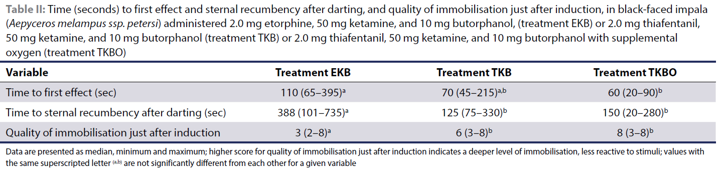 Time to first effect, time to sternal recumbency after darting, and quality of immobilisation are presented in Table II. Time to first effect was significantly longer for EKB compared to TKBO, and time to sternal after darting was significantly longer with EKB compared to TKB and TKBO. Quality of immobilisation just after induction was significantly better with TKB and TKBO compared to EKB.