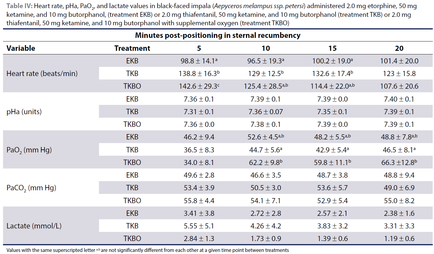 This prospective study was done in two phases: the first compared etorphine- and thiafentanil-based combinations, the second evaluated the influence of oxygen in impala receiving the thiafentanil-based combination. Animals (10 per group) received 50 mg ketamine (K) and 10 mg butorphanol (B), with either 2.0 mg etorphine (E) or 2.0 mg thiafentanil (T). A third group of ten impala were anaesthetised using TKB with supplemental nasal oxygen (O) at a rate of 5 L/minute. Behavioural, metabolic and physiological variables were assessed within five minutes of recumbency and at 10, 15, and 20 minutes post-recumbency. Statistical analyses for non-parametric data were performed to compare the treatment groups as well as time points; p < 0.05 considered significant.