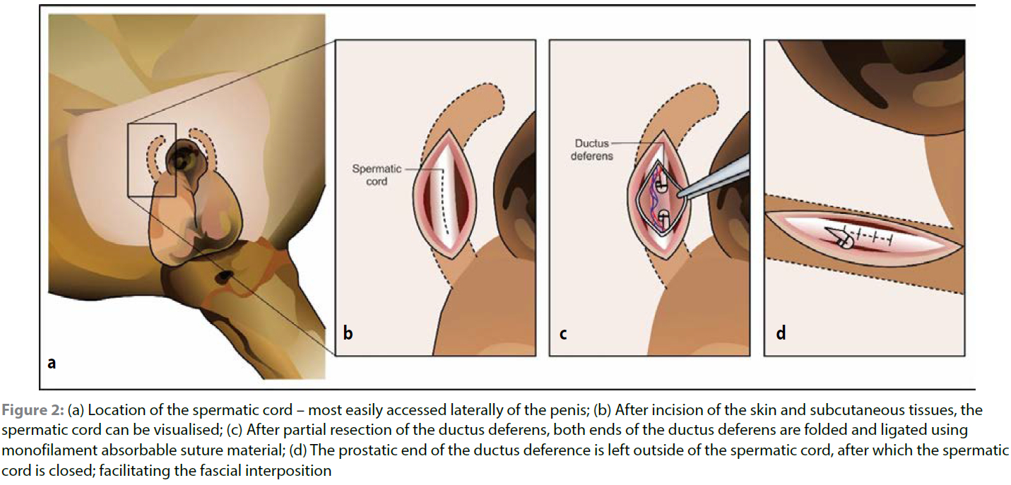 The current knowledge and available literature on the vasectomy in male African lions is limited and outdated (Hahn 1977; Reed & Tennant 1975; Robinson, Sedgwick & Lochner 1975). Although this procedure has to be performed under general anaesthesia, it only has to be performed once. Vasectomy in lions has been shown to be reversible, making it a non-permanent sterilisation (Marconi et al. 2020). The reversal of a vasectomy has been successfully performed by an experienced microsurgeon in a lion, whereafter fertility was resumed (Marconi et al. 2020). Reversal of vasectomies in humans generally has a success rate greater than 90% (Silber et al. 2013). It is important to note that these reversing surgeries are more successful when an 'open-ended vasectomy' technique is used. The key to this technique is leaving the distal (testicular) end open, to allow leakage and prevent the buildup of pressure in the epididymis. The pressure could lead to damage to these male reproduction organs, with epididymal complications leading to a lower success rate (Silber & Grotjan 2004). Using the 'open-ended vasectomy' should be considered when animals might need reversal surgery later on in life.