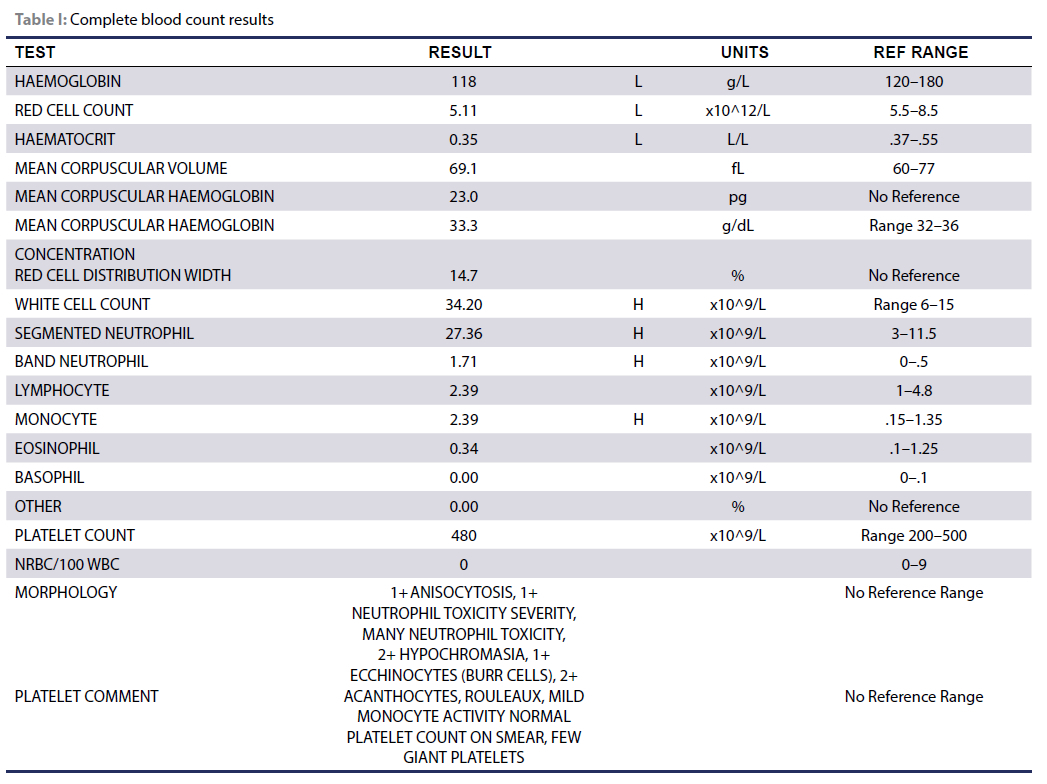 A further clinical examination was within normal limits except for the mass on the perineum. Complete blood count was performed (Table I). Packed cell volume was 35% and there was a marked inflammatory leukogram. Urinalysis revealed 4 plus erythrocytes. There were multiple fistulous tracts associated with the soft tissue mass in the perineum and a serosanguinous discharge from these tracts.