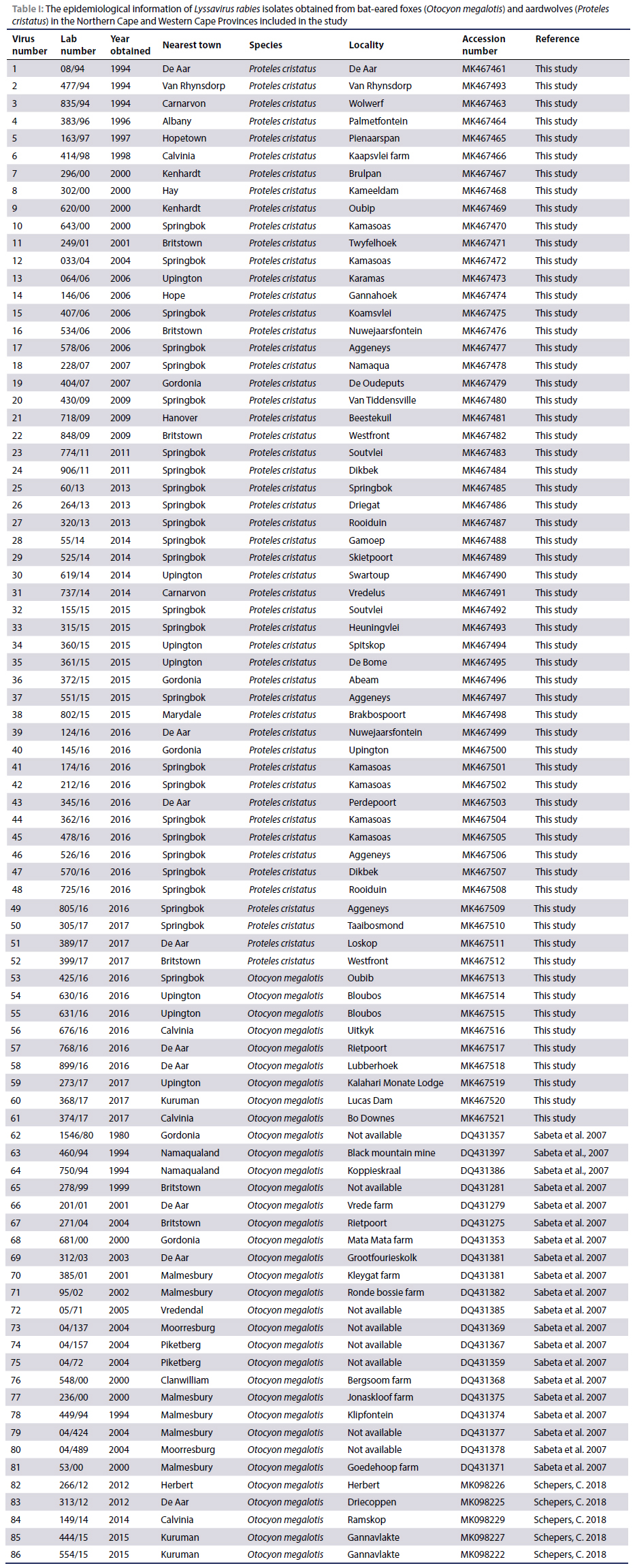 A cohort of 52 RABV isolates collected from aardwolves between 1994 and 2017 were selected from the rabies repository at the Agricultural Research Council, Onderstepoort Veterinary Research (ARC-OVR) (Pretoria, South Africa) (Table I) for this study. The state veterinarians submit rabies-suspected cases to the laboratory for confirmation as part of the national and rabies passive surveillance programme in South Africa. The specimens were initially shown to contain lyssavirus antigen by the direct fluorescent antibody test (dFAT) (Rupprecht et al. 2018) prior to genetic characterisation. The rabies viruses collected between 1994 and 1998 were passaged once in suckling mice and subsequently stored as 20% lyophilised mouse-infected brain tissues. Viruses collected after 1998 were stored as original brain tissues at -70 oC. An additional nine rabies viruses obtained from bat-eared foxes collected between 2016 and 2017 were included in the study as well as previously published nucleotide sequences of rabies viruses obtained from the Northern and Western Cape Provinces of South Africa (Table I). Microsoft Excel version 2019 (Microsoft Corporation, 2018) was used for data management and descriptive statistics.