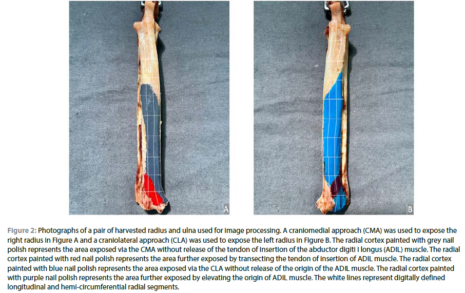 The objective of this cadaveric study was to quantitively compare the exposure of the radius obtained using either the CMA or CLA to the radius, without and with transection of the tendon of insertion (CMA) or release of the origin (CLA) of the ADIL muscle. We were specifically interested in defining longitudinal and hemi-circumferential segments of the radius that were sufficiently exposed via each approach to allow for cranial plate application. We hypothesised that the CLA would provide greater proximal diaphyseal and distal epiphyseal exposure, and the CMA would offer greater distal diaphyseal and metaphyseal exposure. We also hypothesised that release of the ADIL muscle would improve the exposure of the distal diaphyseal, metaphyseal, and epiphyseal region for both approaches. The results of this study should provide surgeons, particularly less experienced surgeons, with objective information to base decisions regarding which approach might be more advantageous when addressing radial fractures at specific locations.