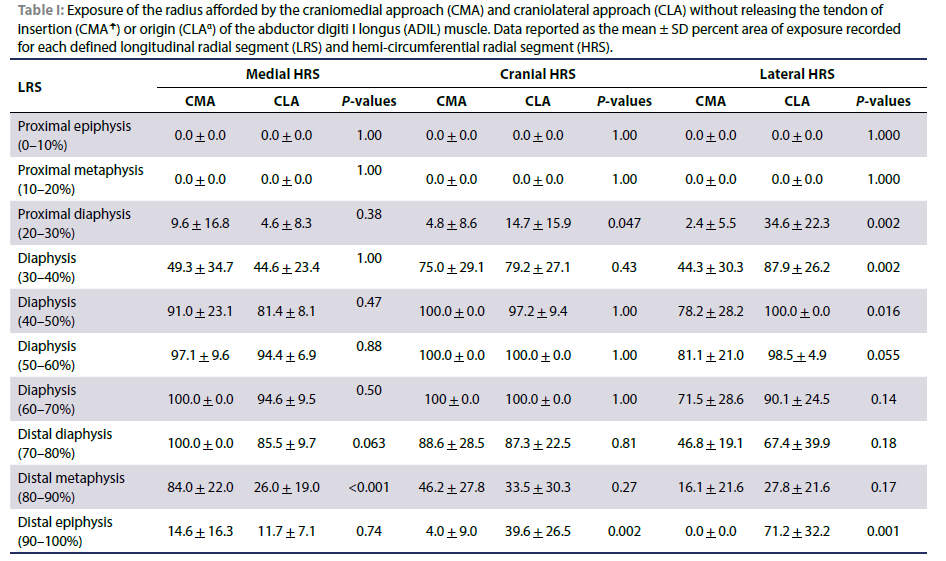 A similar study has been performed using human cadaver specimens to objectively delineate surface area exposure of the radius afforded by different open surgical approaches (Cross et al. 2011). In our study, the CLA affords greater exposure to the proximal lateral diaphysis (20-50% LRSs) and distal lateral and cranial epiphysis (90-100% LRS). There was no significant difference in exposure afforded the CMA and CLA identified in the mid-to-distal diaphyseal region (50-80% LRSs). Most antebrachial fractures in dogs involve the distal radial diaphysis (Ramírez & Macías 2016). Based on our results, both approaches provide sufficient exposure for cranial plate placement in this region and either approach can be used based on the surgeon's preference and case requirements. Plate placement in the distal radial metaphyseal region (80-90% LRS) can be more readily accomplished using the CMA particularly in the medial HRS, without release of the tendon of insertion of the ADIL muscle. Lakshmi, et al. (2007) has advocated using the CMA when performing open plating of distal metaphyseal radial fractures.