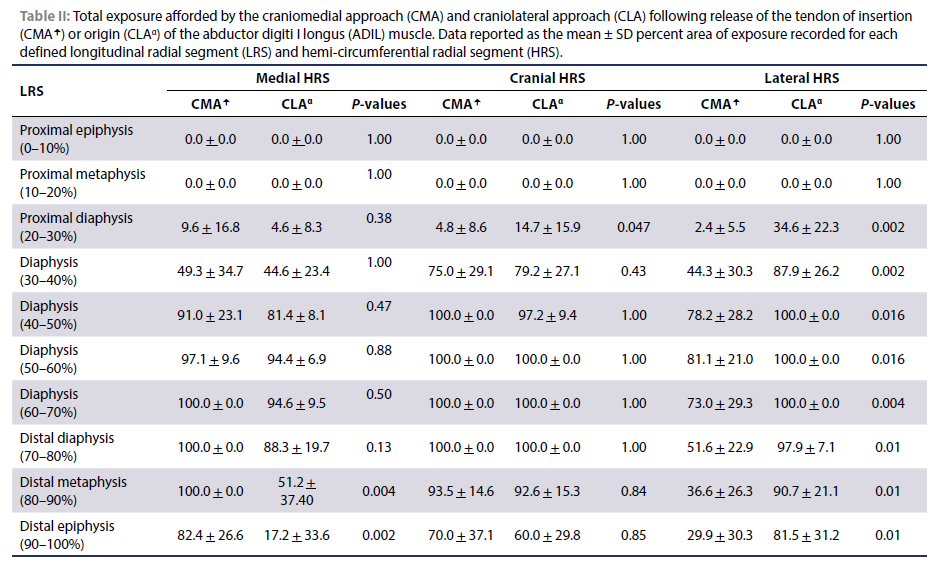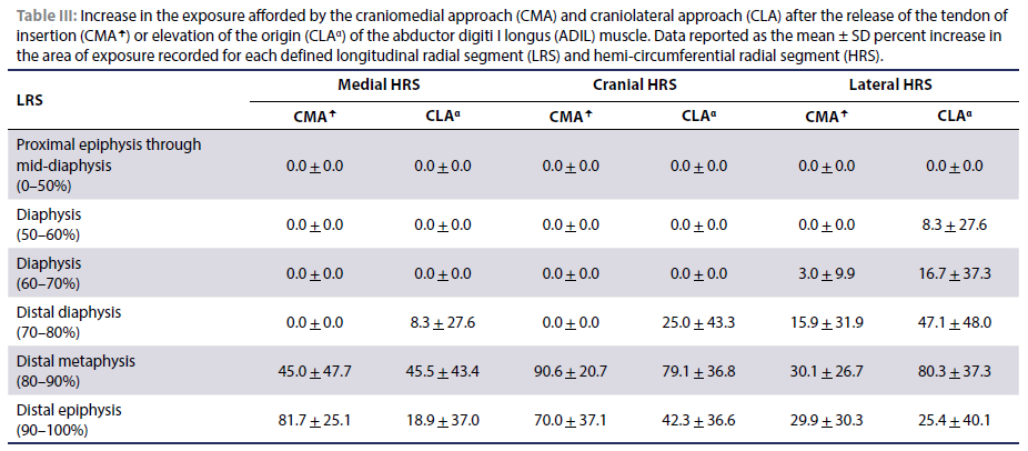 The proximal epiphyseal and metaphyseal regions of the radius (0-20% LRSs) were not exposed through either approach. Exposure of the cortical surface of the radius in these regions would have required elevation of the pronator and supinator muscles. Exposure of the proximal diaphyseal region (20-30% LRS) was limited via the CMA, but the CLA afforded greater exposure in the cranial and lateral HRSs. The exposure of the lateral proximal radial diaphysis (30-50% LRSs) was greater with the CLA than with the CMA. There were no differences in exposure afforded by the CMA and CLA in the remainder of the diaphyseal region with both approaches yielding similar exposure of the radius in this region. While the exposure of the lateral, and to a lesser extent the cranial HRS in the distal metaphyseal region (80-90% LRS) was limited via both approaches, the CMA afforded greater exposure to the medial distal radial metaphysis than the CLA. Exposure of the medial distal radial epiphysis (90-100% LRS) was limited via both approaches, but greater exposure of the cranial and lateral HRSs in the distal radial epiphysis was obtained by using the CLA compared to the CMA.