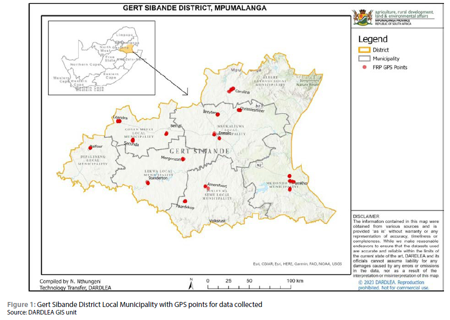 South Africa has nine provinces with a total area of 1 221 037 km2. Mpumalanga is South Africa's second-smallest province after Gauteng, occupying approximately 79 494 km2. Mpumalanga Province has three district municipalities, including: Gert Sibande, Nkangala and Ehlanzeni. The district shares boundaries with three provinces locally, and including Free State, Gauteng and Kwazulu Natal and one international border with eSwatini. The current study was conducted in the Gert Sibande District Municipality (GSDM). The GSDM (26.5471oS, 29.9741oE) is the largest district in MP covering 31 845,9 km2 (41% of the total land area of Mpumalanga). It consists of seven municipalities, including Msukaligwa, Govan Mbeki, Dipaliseng, Lekwa, Pixley ka Seme, Mkhondo and Chief Albert Luthuli (Figure 1). Mining (26%) is the largest economic sector in GSDM, followed by manufacturing (18%), community services (15%), and agriculture with only 3%. The district is hampered by high poverty rates (46.5%) and large unemployment (38.4%) (COGTA, 2020).