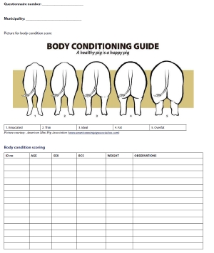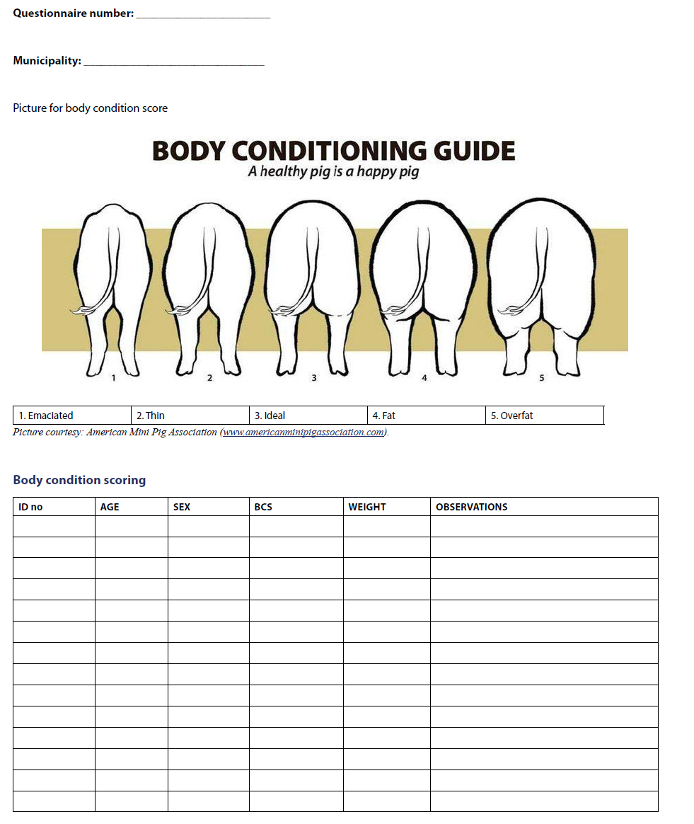 The animal samples were accompanied by a form, which contained the following information: unique code, municipality, age, sex, weight, breed, and body condition. The form was completed for each pig that was sampled (see Appendix 2).