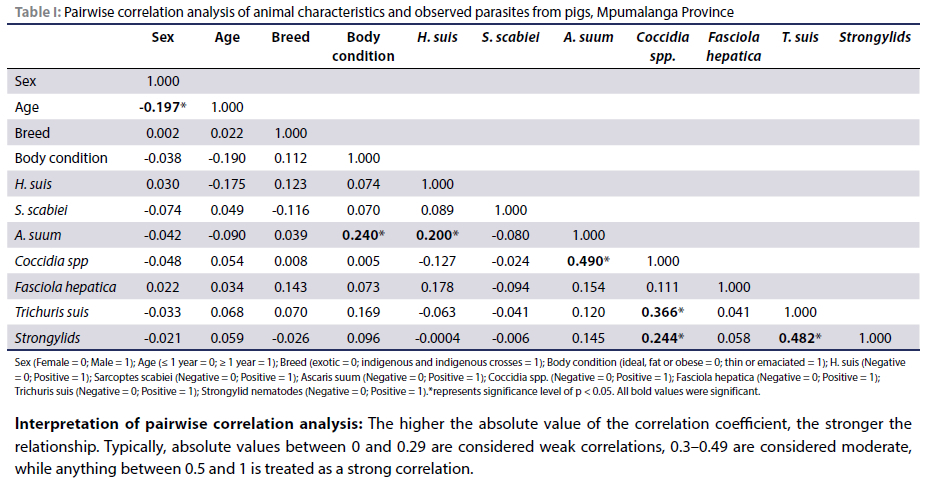 A total of 283 pigs of various ages were sampled. The association between Ascaris suum and body condition was weak but significant (r = 0.24; p < 0.05). Similarly, the association between Ascaris suum and H. suis was weak but significant (r = 0.20; p < 0.05), while the correlation between Ascaris suum and Coccidia spp. was moderate but significant (p < 0.05). In addition, Trichuris suis was a moderate positive predictor for Coccidia spp. (r = 0.37; p < 0.05) but a weak positive predictor for Strongylids (r = 0.24; p < 0.05). Finally, the association between the Strongylids and T. suis was moderate predictor (r = 0.48; p < 0.05) (Table I).