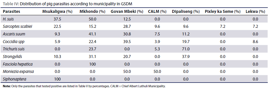 The prevalence of parasites in FRP from the different municipalities varied. Mkhondo had the highest prevalence of H. suis (50.0%), followed by Msukaligwa (37.5%) and Govan Mbeki (12.5%). On the other hand, H. suis was not isolated in certain municipalities such as Chief Albert Luthuli Municipality (CALM), Lekwa, Pixley ka Seme, and Dipaliseng (Table IV). Sarcoptes scabiei was found in 9.6% of the pigs tested in each of CALM and Dipaliseng. Govan Mbeki (28.7%) and Mkhondo (15.2%), each yielded a higher number of positive samples. Only 7.2% of the pigs from each of Pixley ka Seme and Lekwa were positive.