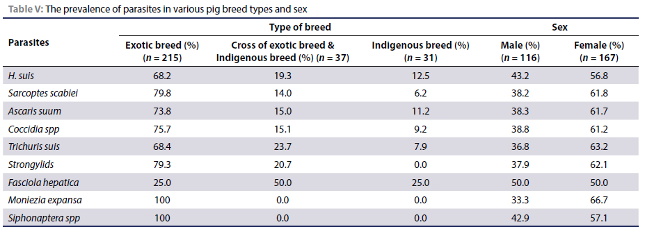 In terms of sex, female pigs (167) had a higher parasite load than the male pigs (116) (Table V). The exception was Fasciola hepatica which was found in equal proportions (50%) in both male and female pigs (Table V).