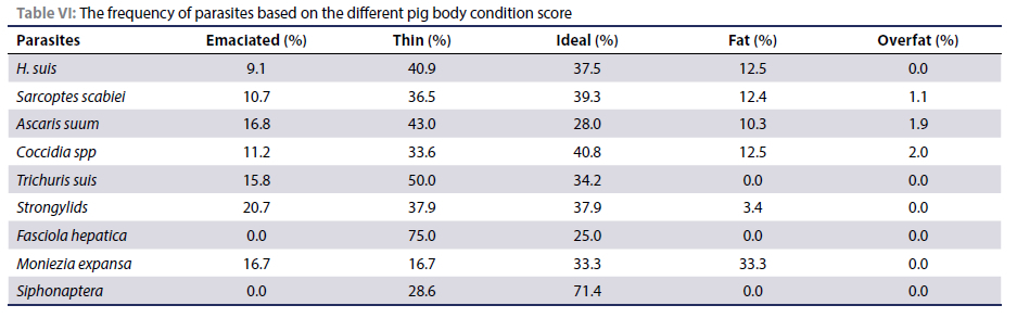 The pigs that had a thin or ideal BCS tended to carry a higher parasite burden than those with an emaciated BCS. The least parasite burden was found among the fat and overfat pigs. Moniezia expansa (33.3%) was predominant in pigs with an ideal and fat BCS (Table VI), while thin pigs (75.0%), had a higher proportion of Fasciola hepatica-positive pigs. Siphonaptera infestation was also high in pigs with ideal body conditions (71.4%) (Table VI).