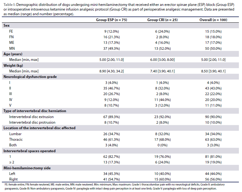 Three hundred and thirty-four records of dogs that underwent spinal surgery addressing IVDD were retrieved; of these, 75 case records met the inclusion criteria for the ESP group and were sufficiently complete to be included in this study, and they were compared to the 25 cases that met the inclusion criteria for the CRI group. All the surgical procedures performed were thoracic or lumbar mini-hemilaminectomies, and they were performed by several different surgeons. All the ESP blocks were performed unilaterally on the side where the mini-hemilaminectomy was to be carried out. The results of the demographic data are given in Table I.