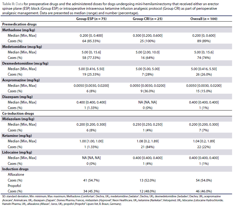Descriptive statistics for preoperative drugs, and intraoperative recorded variables are presented in Tables II and III respectively. Concerning the administration of NSAIDs in the 24 hours before surgery, within the ESP group, 52/75 dogs (69.33%) received NSAIDs, while 21/75 dogs (28%) did not receive any NSAIDs. For the remaining two dogs (2.66%) in this group, there was evidence that the referring veterinarian had prescribed NSAIDs before admission to our hospital; however, information regarding the administration time could not be verified in the clinical history. The NSAIDs used in the ESP group were meloxicam in 46 dogs, robenacoxib in four dogs, and carprofen in two dogs.