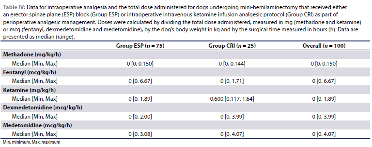 Regarding postoperative maintenance analgesia, in the ESP group, 31/75 (41.33%) received gabapentin, paracetamol and meloxicam, 23/75 (30.66%) received gabapentin and meloxicam, 9/75 (12%) received gabapentin and paracetamol, 4/75 (5.33%) received gabapentin and robenacoxib, 2/75 (2.66%) received gabapentin, paracetamol and robenacoxib, 2/75 (2.66%) received gabapentin and carprofen, 1/75 (1.33%) received gabapentin, paracetamol, and memantine, 1/75 (1.33%) received gabapentin, paracetamol and carprofen, 1/75 (1.33%) received paracetamol and memantine, and 1/75 (1.33%) received robenacoxib only. In the CRI group, 10/25 (40%) received gabapentin, paracetamol, and meloxicam, 7/25 (28%) received gabapentin and meloxicam, 3/25 (12%) received gabapentin and paracetamol, 1/25 (4%) received gabapentin, paracetamol, and robenacoxib, 1/25 (4%) received gabapentin, paracetamol, and firocoxib, 1/25 (4%) received meloxicam and paracetamol, 1/25 (4%) received meloxicam and tramadol, and 1/25 (4%) received gabapentin only. The rest of the data is presented in Table V.