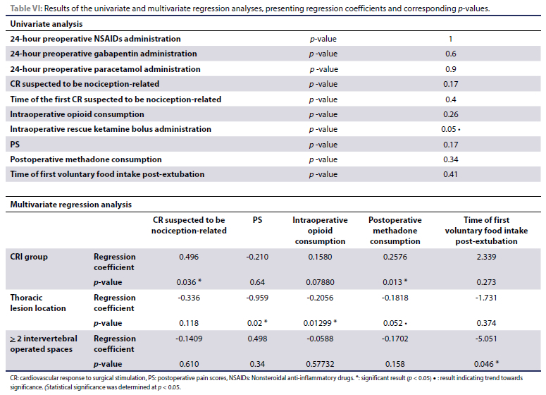 The first section of the Table VI shows the outcomes of the univariate analysis between treatment groups [dogs undergoing mini-hemilaminectomy that received either an erector spinae plane (ESP) block (Group ESP) or intraoperative intravenous ketamine infusion analgesic protocol (Group CRI) as part of perioperative analgesic management] for 24-hour preoperative NSAIDs administration, 24-hour preoperative oral analgesic administration (gabapentin and paracetamol), CR suspected to be nociception-related, time of the first CR suspected to be nociception-related, intraoperative opioid consumption (total intraoperative dose of methadone and fentanyl normalised according to equivalent potencies to morphine), administration of intraoperative rescue ketamine bolus, PS, postoperative methadone consumption, and time of first voluntary food intake post-extubation. The second section of the table shows the outcomes of the multivariate regression analysis. This analysis explores the correlation among treatment groups (ESP group vs. CRI group), lesion location (thoracic vs. lumbar), and the number of operated intervertebral spaces (1 vs. > 2) in relation to CR suspected to be nociception-related, PS, intraoperative opioid consumption (total intraoperative dose of methadone and fentanyl normalised according to equivalent potencies to morphine), postoperative methadone consumption, and time of first voluntary food intake post-extubation.)