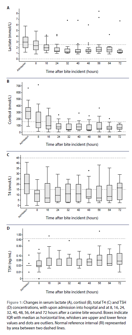 METHOD: Prospective study involving 20 dogs hospitalised after being bitten by another dog. Serum cortisol, thyroxine (total T4), thyrotropin (TSH), and lactate concentrations were measured on admission and every 8 hours after the recorded bite incident, for a 72-hour period.