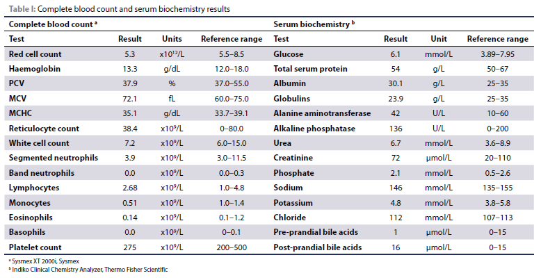 AED therapy was continued. Empirical broad-spectrum antibiotic therapy was initiated as amoxicillin-clavulanic acid (20 mg/kg IV q12h, Sandoz Co-amoxyclav 1.2 g, Sandoz SA LTD). Prednisolone (0.5 mg/kg IV q24h, Prednisolone 1%, V-Tech LTD) was administered to reduce secondary inflammation and oedema. The patient deteriorated to a comatose state. This was suspected to be due to increased intracranial pressure and mannitol (0.5 g/kg IV, Sabax Osmitrol 20% in Viaflex, Adcock Ingram Critical Care LTD) was administered over 20 minutes.