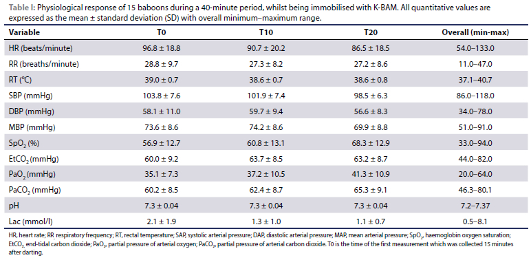 Cardiovascular parameters appeared stable in all animals. The HR of between 86.5 and 96.8 beats per minute is similar to values of between 90 and 110 beats per minute reported in habituated baboons by Brent & Weaver (1996). The same authors also reported a MBP of 90 to 96 mmHg, which is slightly higher than the MBP measured in baboons immobilised with K-BAM (69.9 to 74.2 mmHg).