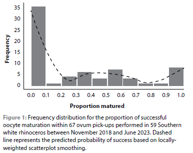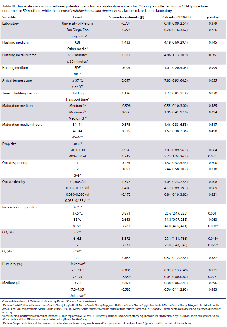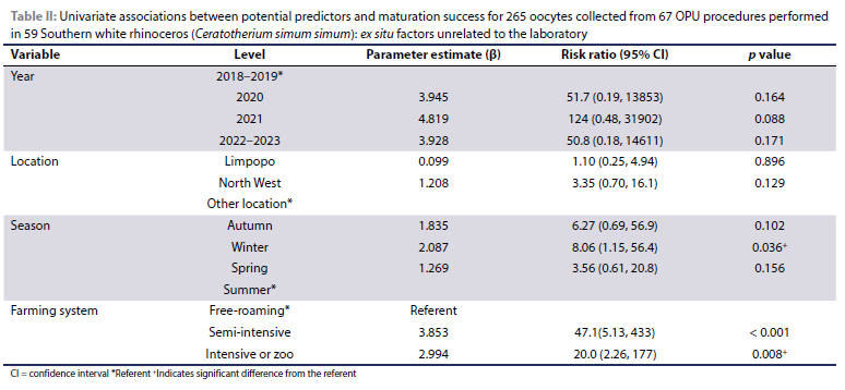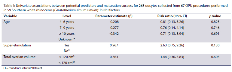 This study forms part of a bigger project where the main focus is to develop ART protocols towards conservation efforts of rhinoceros species using the SWR as a model. The aim of this study was to identify (independent) predictors of rhinoceros oocyte maturation success following OPU performed on a large number of rhinoceros across a wide geographical area.