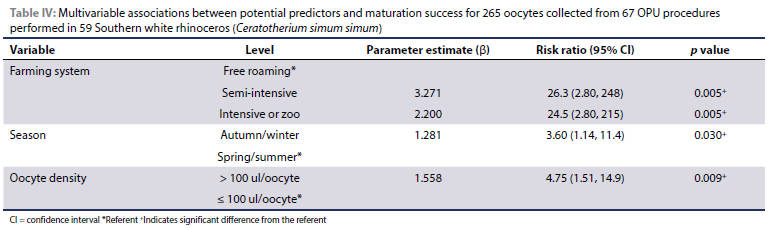 The final multivariable model identified breeding season, farming system and lower oocyte density as independent predictors of successful maturation (Table IV).