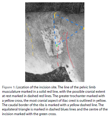 Unilateral ovariohysterectomies were undertaken by a left-lateral laparotomy (left-flank approach). The site was shaved, surgically prepared and draped, with the surgeon gloved and gowned. The pelvic limbs were tied together just above the tarsus and retracted to full extension, then fixed in position to avoid an incision into the pelvic limb musculature (sartorious) as has been reported in domestic cats. A 4-6 cm dorsoventral incision was made, with a size 15 scalpel blade and scalpel (No 3, Swann-Morton, Sheffield, UK), through skin, subcutaneous tissue, muscle and peritoneum, using the greater trochanter of the femur and the most cranial aspect of the wing of the ileum as anatomical landmarks to locate the incision site, as per Ladlow 2015:354. This is an equilateral triangle, with the most cranial aspect of the iliac crest, the great trochanter of the femur and the centre of the incision site, being the three corners of the triangle (Figure 1).