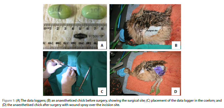 Miniature temperature data loggers were successfully implanted into the coelomic cavity of 28 two-week-old ostrich chicks. There were no surgical complications and the birds recovered quickly from anaesthesia. Normal activity and behaviour, such as feeding and walking, returned within 30 minutes after surgery. Anaesthesia resulted in temporary unsteady movements, characterised by staggering and shivering, for about 15 minutes after surgery. These observations are attributed to the effects of anaesthesia rather than postoperative discomfort, given the lack of pain-related behaviour. Inhalation anaesthesia, which is recommended for the induction and maintenance in birds, offers advantages such as rapid induction and recovery (Gunkel & Lafortune 2005). Adult ostriches have been reported to regain consciousness within 20 minutes after inhalation anaesthesia was removed from the birds (Fuller et al. 2003), while in chickens the recovery period after anaesthesia was two to three hours (Kuroki et al. 1999). Each ostrich chick was carefully monitored after surgery, with no signs or symptoms of clinically induced disease or infection during the observations.