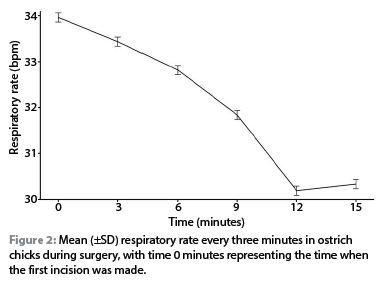 During surgery, the respiratory rate of individual chicks ranged between 16 and 52 breaths per minute, with a mean of 32 breaths per minute (Figure 2). The surgical procedure lasted between 11 and 18 minutes, with a mean of 13 minutes, and was associated with a curvilinear decline in respiratory rate (Figure 2). On average, the chicks regained consciousness within five minutes. All of the chicks recovered well from surgery, with no anaesthesia or surgery-related complications, and no deaths recorded for more than one month after surgery.