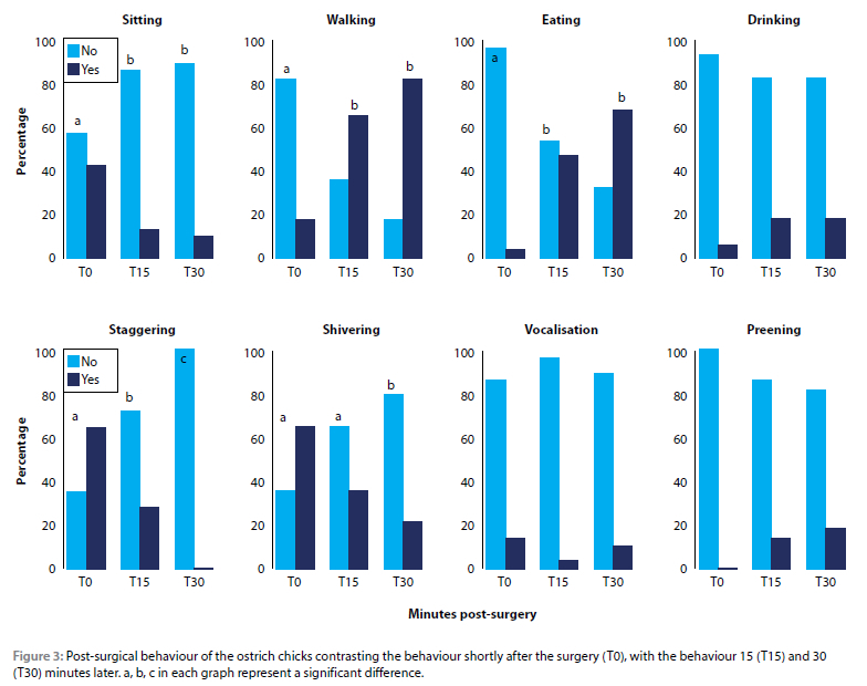 After discontinuation of isoflurane administration, all ostriches regained consciousness and were able to stand within 15 minutes after being placed in the recovery area. None of the chicks displayed signs of discomfort or irritation, such as pecking or scratching at the incision site. The percentage of chicks partaking in various behaviours over time is shown in Figure 3, with significant changes in the proportion of chicks engaged in the different behaviours over time. There was a significant decrease in sitting between T0 and T30 (p = 0.03), with a notable decrease already at T15 (p = 0.06). There was no significant difference in sitting between T15 and T30 (p = 0.91). There was a significant increase in eating between T0 and T15 (p = 0.01) and between T0 and T30 (p = 0.001), indicating that the birds were more likely to eat as time after surgery increased. There was no significant difference in eating between T15 and T30 (p = 0.24) however, indicating that eating behaviour had returned to normal as soon as 15 minutes after surgery.