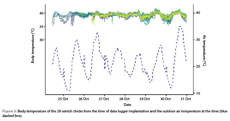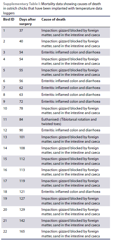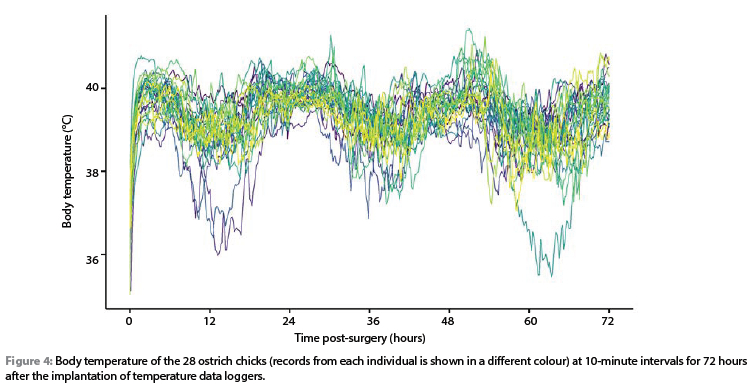 This study represents the first report of successful surgical implantation of data loggers for the continuous monitoring of body temperature in ostrich chicks. While the implantation method was invasive and required surgical skills and specialised equipment, it offers the advantage of long-term, non-invasive, collection of continuous data. The normal core body temperature range for ostrich chicks has not previously been explicitly documented. In the seven days following the implantation of the data loggers, the body temperatures ranged between 35.5 and 41.8 °C. Despite some chicks having unusually low body temperatures at 12 and 60 hours after surgery, all of the chicks recovered from the surgery and survived for at least a month thereafter. The range of body temperature recorded in our study corresponds to cloacal temperature measurements taken during daylight (37.1-41.9 °C) for chicks of a similar age (Brown & Prior 1999). However, cloacal temperature measurements are often affected by stress and poor probe positioning (Louw et al. 1969; Schmidt-Nielsen et al. 1969), which can result in variability in the measured body temperature. The body temperature range for the chicks in this study overlapped with the range of juvenile and adult ostriches (37.2 - 43.3 °C) that has been reported previously (Louw et al. 1969; Schmidt-Nielsen et al. 1969; Schrader et al. 2009), although the higher end of our range was lower than reported previously. Both Louw et al. (1969) and Schmidt-Nielsen et al. (1969) used cloacal temperatures, which may have contributed to the higher body temperature recordings in the birds in those studies, as compared to ours. Despite high mortality rates in chicks with surgical implants, similar mortality rates were noted in chicks without implants, indicating mortalities were not attributable to implantation and surgical procedures. Although the observed mortality rate is high, previous research has documented rates in ostrich chicks within the high range of 78-100% (Terzich & Vanhooser 1993; Cloete et al. 2001; Keokilwe 2013), suggesting high mortality rates are not uncommon in ostrich farming.