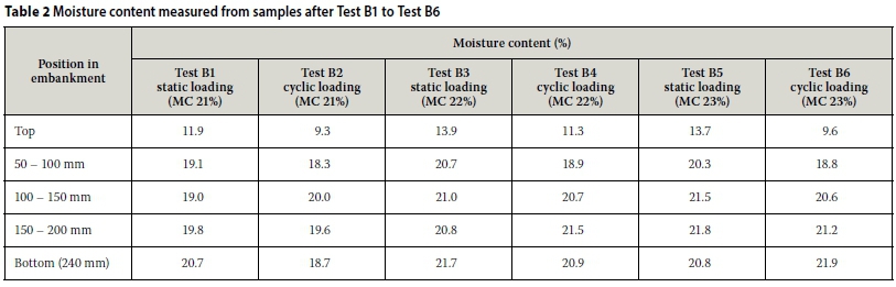 The settlement difference between static and cyclic loading with regard to loaded time increased by 8.7% for the 21% and 22% moisture content tests. However, a 51% increase in the settlement difference was observed for the 22% and 23% moisture content tests. This emphasises the effect that the moisture content of a soil has on its shear strength when the moisture increases above the moisture content corresponding to the air entry value and the level of saturation. At this level of saturation there is a definite decrease in pore water suctions, and hence the shear strength of the material, which can be expected to result in an increase in embankment settlement under loading.
