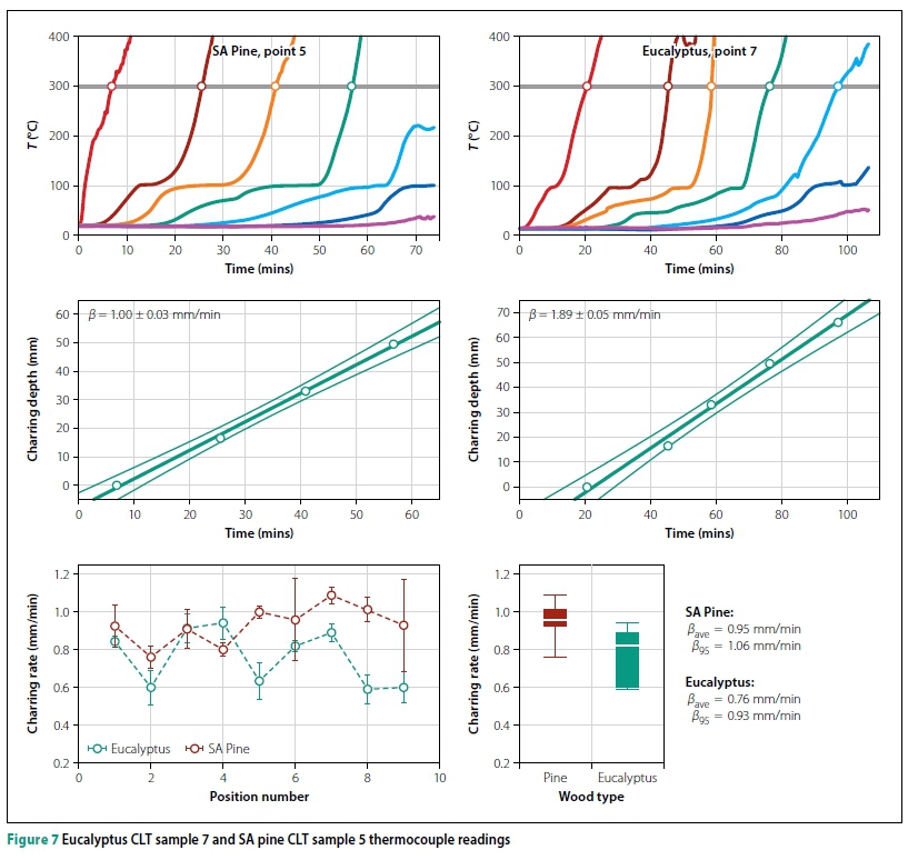 The progress of the charring front into the CLT panels is summarised in Figures 7 and 8. The process of inferring the progress of the charring front and determining the charring rate is illustrated in Figure 7 for point 5 and point 7 on the SA pine and eucalyptus samples, respectively (sample position numbers are as shown on Figure 5). A temperature of 300°C was used as the reference temperature for charring, and the time that elapsed between the start of the test and each thermocouple reaching 300°C was recorded.
