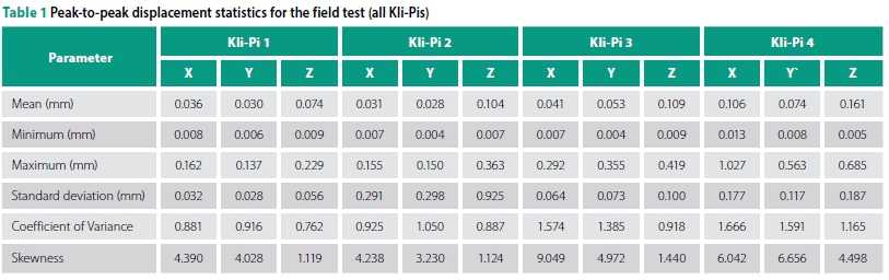 The following tables provide a summary of the field test statistics - statistics of the displacement (Table 1), rotation (Table 2) and work energy (Table 3).