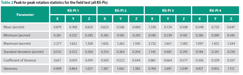 The relationship between the rotation statistics and depth of installation is less clear compared to the displacement statistics. From the time-series data it was concluded that the preferred axis of rotation is primarily associated with the behaviour of the sleeper. The largest mean rotation (Figure 15) is associated with Kli-Pi 3 which is prone to transverse PSR resulting from the sleeper above, followed by Kli-Pi 1. The mean peak-to-peak amplitude for any instrument or DoF remains relatively small, with only a fraction of a degree rotation being measured. This finding was verified during the analysis stage, whereby the rotational velocity (prior to the integration to calculate the attitude or orientations) was rarely measured to be greater than one degree per second.