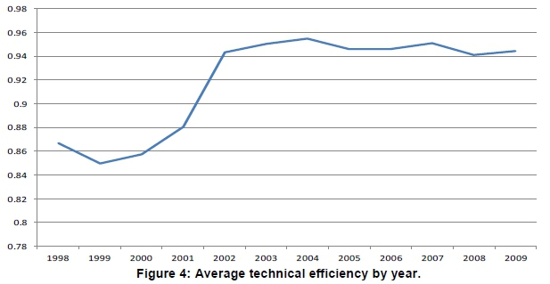 Figure 4 shows the temporal average annual technical efficiency evolution of all utilities analysed. The technical efficiency levels show an ascending evolution, increasing from 86.6% in 1998 to highest level of 94.4% in 2009. Comparison between these results and those from previous studies [10, 11] shows two major differences. First, in the earlier studies, the average technical efficiency is significantly lower. The closest value corresponds to the multi-output model in [10] where a TE under VRS of 88% in 1998 and 87% in 2005 was found.