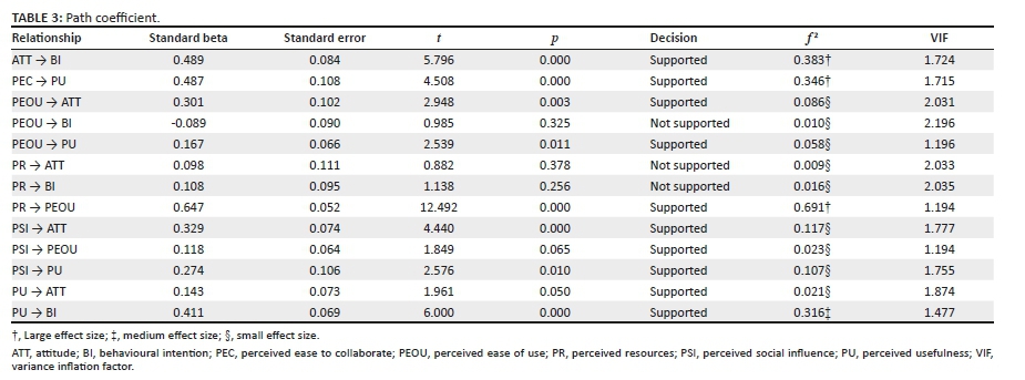 The measurement model describes the association between indicators and the latent variables. Following the suggestion by Hair et al. (2017) of assessing reflectively measurement models, the study examined composite reliability (CR), outer loadings, average variance extracted (AVE) and discriminant validity. First, the factor loadings and CR were used to test for item reliability and convergent validity, respectively. The results (Table 1) showed that almost all outer loadings were higher than 0.7 (Chin 1998) except PSI3 (0.646). The item was not removed because of the exploratory nature of the study and removing it did not increase the CR (Garson 2016). Items that were removed from the model because of having outer loadings lower than 0.7 were: PEOU4, PEOU5, ATT5, PR3 and PEC3. When these items were removed from the model, the CR of their respective constructs increased above the recommended threshold of 0.7 (Hair et al. 2017). The results confirmed item reliability. Composite reliability values show the extent to which the items indicate the latent variable. Table 1 shows that all the CR values exceeded the recommended value of 0.7 (Garson 2016). Second, the AVE values were used to assess convergent validity. Convergent validity assesses the degree to which measures of the same constructs positively correlates with each other (Hair et al. 2017). The AVE values indicate the average commonality for each construct in a reflective model (Chin 1998). All the AVE values were greater than the recommended 0.5 (Garson 2016). Third, the Heterotrait-Monotrait ratio of correlations (HTMT) and the Fornell-Larcker criterion were used to assess discriminant validity. Discriminant validity assesses the degree to which a construct is truly different from other constructs (Hair et al. 2017). Table 2 shows that all the HTMT values were under 0.9, and all the square roots of AVE were higher than the inter-construct correlations (Garson 2016). The results confirm discriminant validity.