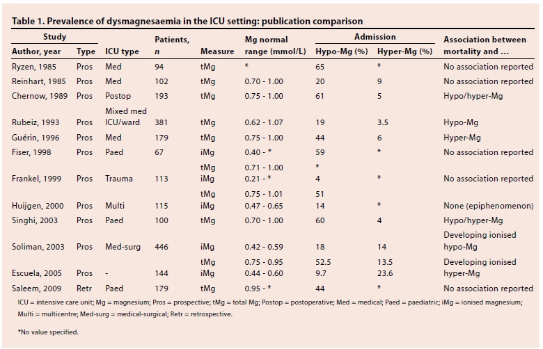 It is still unclear, therefore, whether or not dysmagnesaemia is correlated with a worse outcome in critically ill patients. The objective of this retrospective study was to investigate the prevalence of dysmagnesaemia among patients admitted to a level 1 (Trauma Society of South Africa criteria) trauma intensive care unit (ICU) and to determine if dysmagnesaemia is associated with worse outcome.