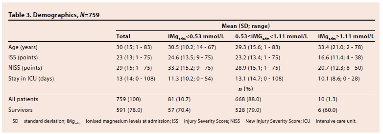 The prevalence of hypermagnesaemia at admission (1.3%) in this trauma population was markedly lower than any other reported in the literature (14% and 23.6%).[7,18] A possible explanation is that the normal range used for Mg is broader than that in other studies (0.53 -1.11 compared with 0.42 - 0.59 and 0.44 - 0.60 mmol/L).[7,18] However, re-analysing these study data with a normal iMg interval of 0.44 - 0.60 mmol/L also yielded dissimilar results. The laboratory method used locally, namely spectrophotometry, could potentially give less-accurate values than the ion-selective electrodes used in other studies, thus explaining the need for a broader normal interval, as well as a difference in admission dysmagnesaemia that cannot be corrected using a different normal interval.