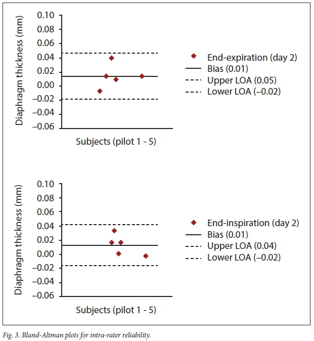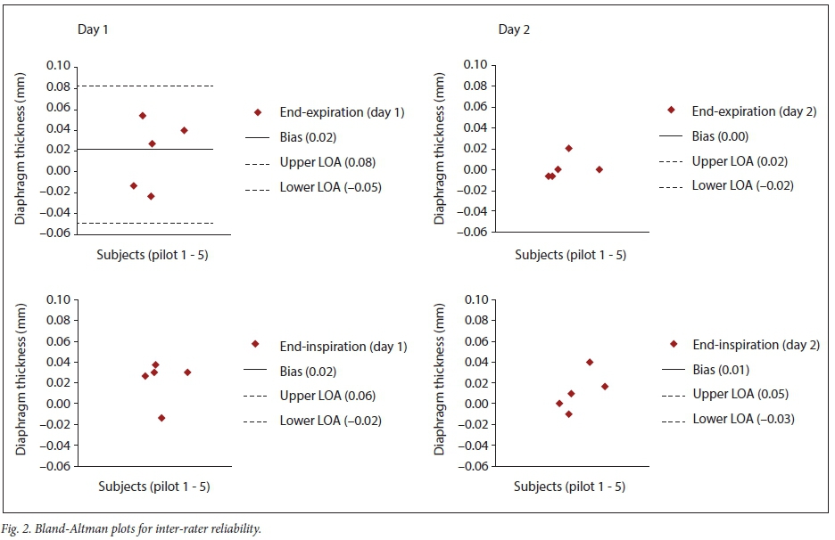 Based on the results of the tests of inter-rater reliability, it is evident that there is excellent agreement between researchers. The observed improvement in agreement between researchers from day 1 to 2 two could indicate that the accuracy of measurements will improve over time with practice and experience, as positioning of the US probe is patient-specific owing to differences in chest size, age, etc. Measurements of end-inspiration showed slightly better agreement than measurements of end-expiration, which could be due to better visualisation of the diaphragm during end-inspiration as the diaphragm thickens, than during end-expiration; although, on day 1, the measurements of end-inspiration showed better agreement than measures of end-expiration, while end-expiration showed better correlation than end-inspiration on day 2.