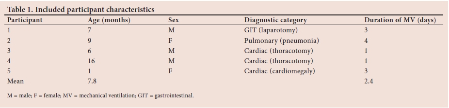 A total of 145 PICU patients were screened by the primary researcher for inclusion into the study from 18 July 2016 - 31 August 2016. Twelve patients met the inclusion criteria and, owing to unobtained consent, only 5 (3 male) patients were ultimately included in this reliability study. Baseline demographic data of included participants are shown in Table 1.