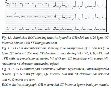 A 41-year-old man was admitted to the intensive care unit at Steve Biko Academic Hospital with acute pancreatitis, suspected clinically based on a raised amylase level (450 U/L; reference range: 20 - 104 U/L), and later confirmed on a computed tomography (CT) scan. Pancreatitis was due to the use of herbal medication and a cytomegalovirus infection (viral load: 5472 U/L). The patient was HIV co-infected (stage 4 according to World Health Organization staging guidelines), but highly active antiretroviral therapy had not been initiated. In addition, he had stage 3 chronic kidney disease (CKD), proven on biopsy to be due to HIV-related focal segmental glomerulosclerosis, complicated by anaemia and secondary hyperparathyroidism. The patient developed severe, acute hypocalcaemia (corrected serum calcium level: 1.09 mmol/L; reference range: 2.15 - 2.50 mmol/L), precipitated by pancreatitis-induced saponification and aggressive administration of saline. Clinically, this presented as a positive Trousseau's sign during blood pressure measurement and a prolonged corrected QT (QTc) interval (360 ms) on the electrocardiograph upon admission (Fig. 1A). The patient became unexpectedly unstable 24 hours post admission and developed acute pulmonary oedema that required ventilation. An electrocardiogram performed at this time revealed ST elevation in keeping with an acute myocardial infarction (Fig. 1B). Serum troponins were initially within the normal range (40 ng/L), but later became markedly elevated (peak: 4 358 ng/L). His urine output remained >1 mL/kg/h.