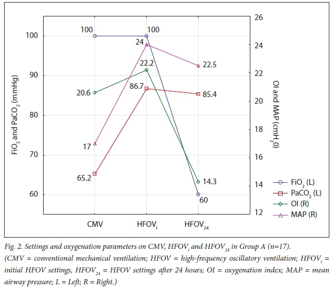 RESULTS. Thirty-four (32.7%) patients were managed with HFOV in the PICU during the study period. Thirty-three of the 34 patients had paediatric acute respiratory distress syndrome. Indications for HFOV were inadequate oxygenation in 17 patients (50%), and refractory respiratory acidosis in 15 patients (44.1%) (2 patients did not fit into either category). Approaches to the setting of HFOV varied considerably, particularly with respect to initial pressure around the airways. HFOV was effective at improving both oxygenation, with a median (interquartile range (IQR)) decrease in oxygenation index of 6.34 (5.0 - 9.5), and ventilation with a the median decrease in PaCO2 of 67.6 (46.2 - 105.7) mmHg after 24 hours. Overall mortality was 29.4% in the HFOV group, which is consistent with other studies.