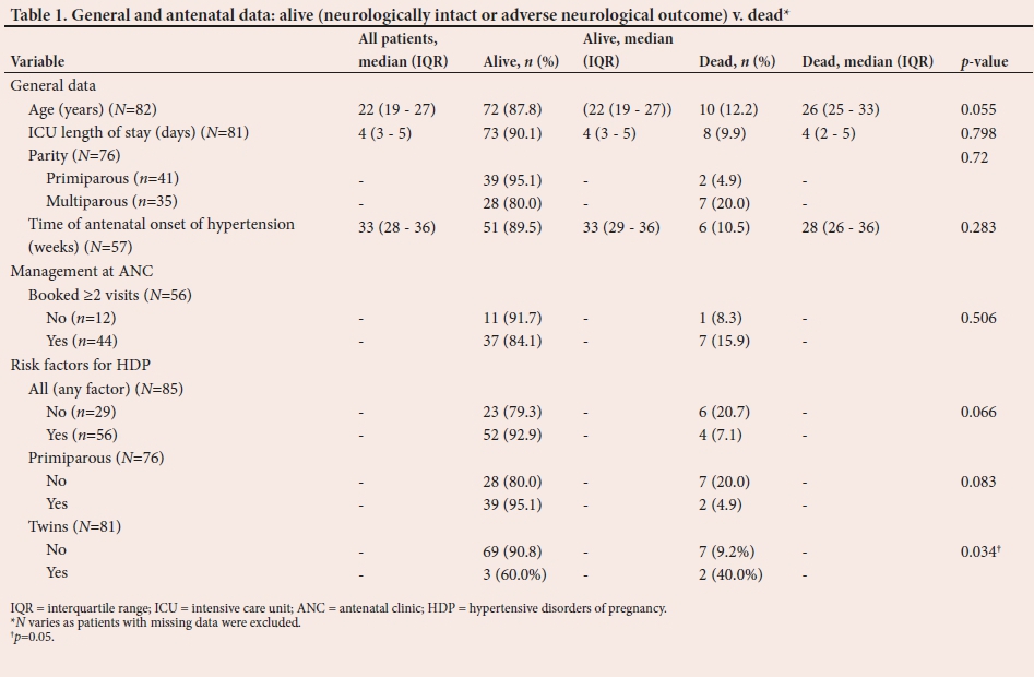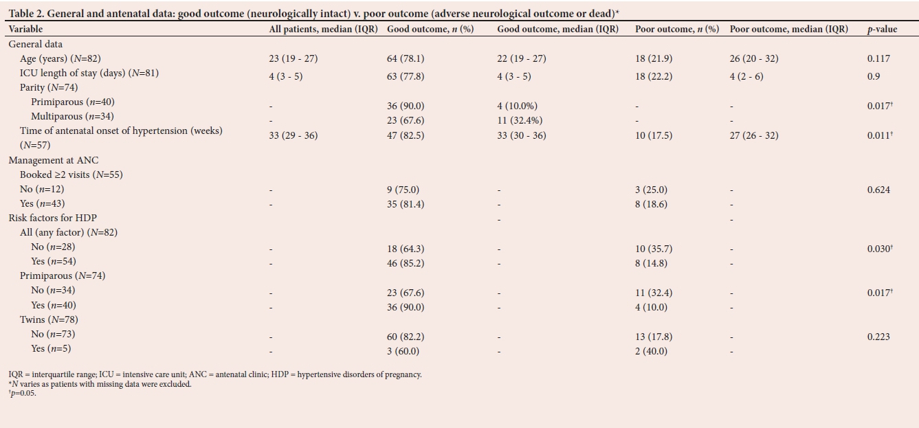 METHODS. The data of 85 patients admitted with HDP to ICU at King Edward VIII Hospital from 2010 to 2013 were retrospectively reviewed. Mortality and adverse neurological outcome (Glasgow Coma Scale (GCS) <14 on discharge from ICU) were assessed. Two sets of analyses were conducted. The first compared those alive on discharge from ICU with those who died in ICU. The second compared good neurological outcome with poor outcome (adverse neurological outcome, or death).