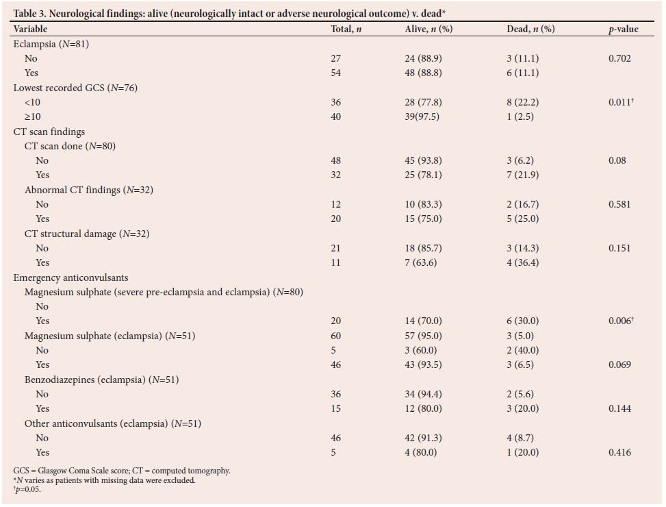 Over the 4-year period from 2010 to 2013, there were 231 obstetrics patients admitted to ICU, out of a total of 1 528 ICU admissions (15.1%). Of these, 102 (44% of obstetrics admissions) had HDP-related complications, the data of 85 of whom were analysed. Neurological outcome was unknown in three patients («=3/85) who were alive on discharge from ICU.