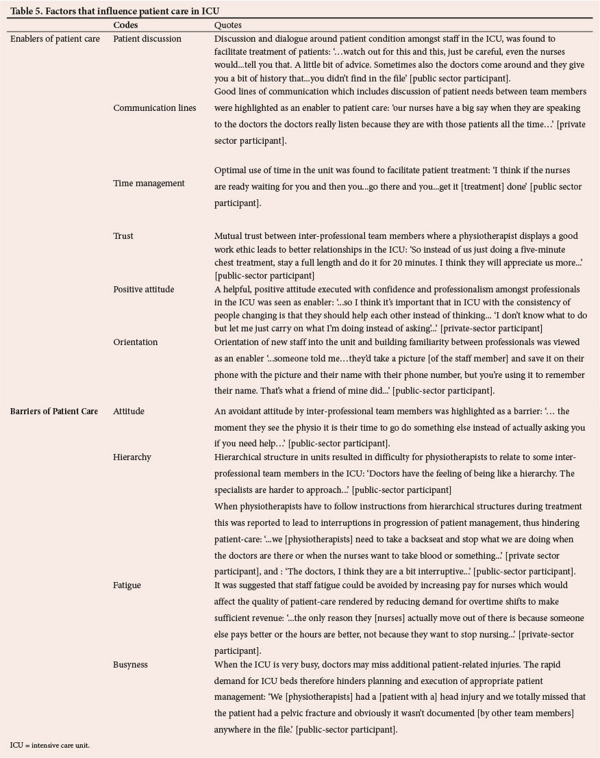 A factor that enabled quality patient care in ICU was identified as having open lines of communication within the inter-professional team, and barriers were medical hierarchy and not having regular access to other healthcare professionals (Table 5).